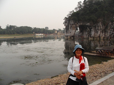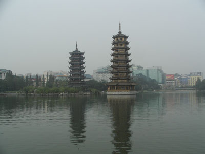 市内観光は3年前に出来た日塔、月塔から。ここの桂林瀑布大酒店は一流らしい。