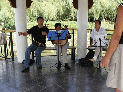 二胡とバンジョウの伴奏で歌う老人、緑豊かで安らぎを覚えた。
