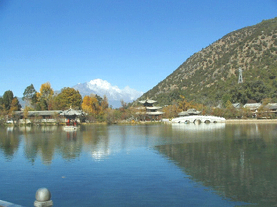 麗江玉泉公園の池に映る玉龍雪山
